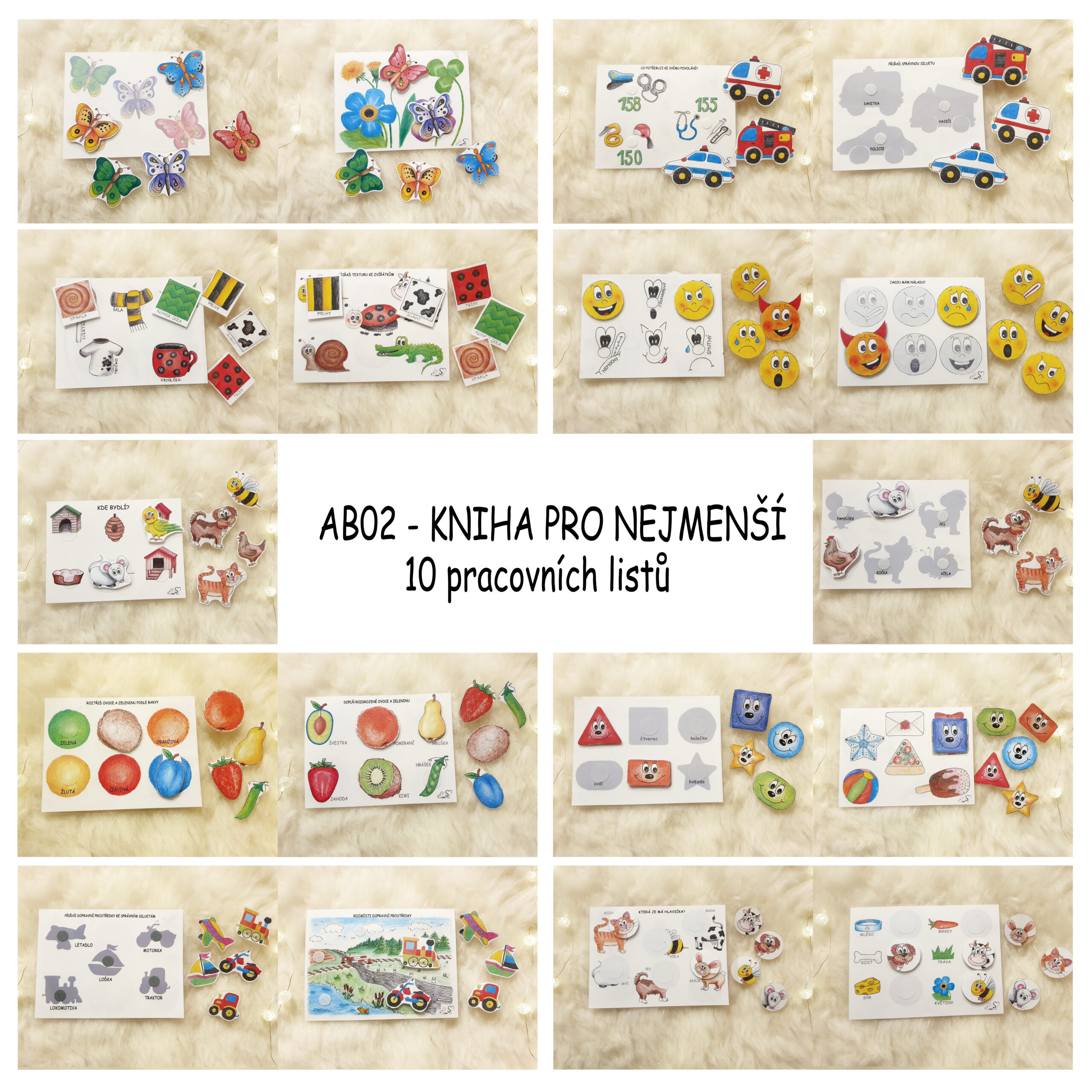 Kniha rozšiřuje dítěti slovní zásobu, naučí se pojmenovávat ovoce a zeleninu, dopravní prostředky, zvířátka, tvary, emoce a barvy.