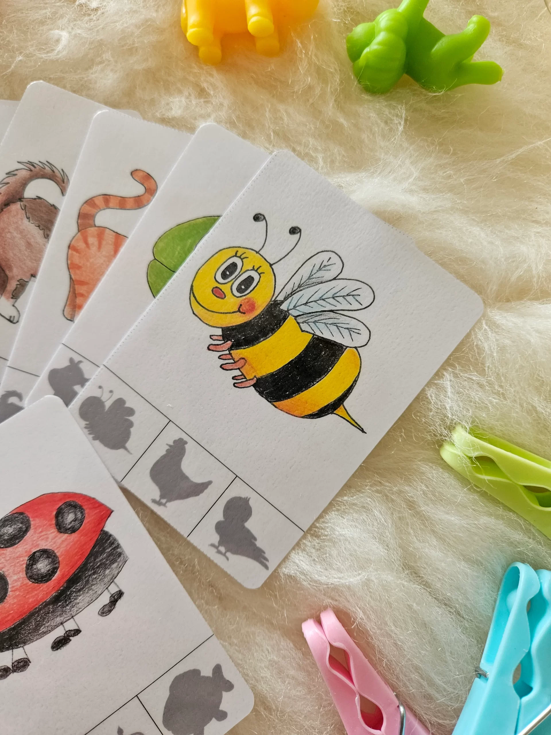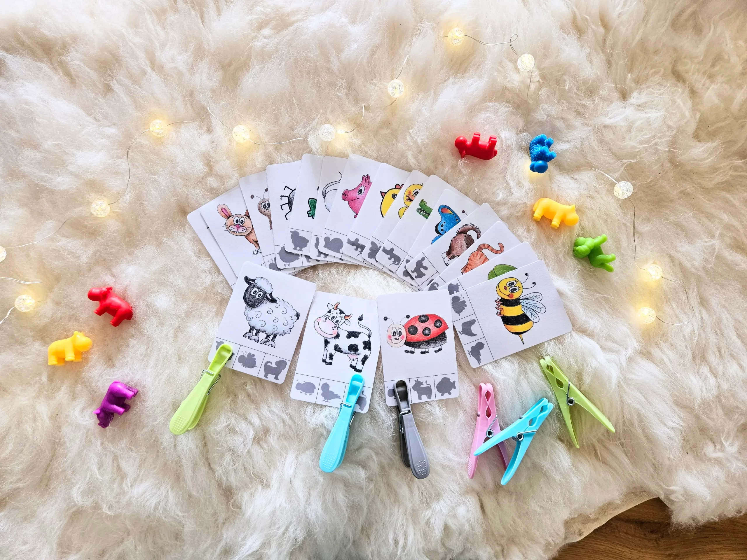 • Úkolem dítěte je umístit kolíček, bambulku, nebo lego kostku na číslici odpovídající počtu zvířátek na kartičce.
